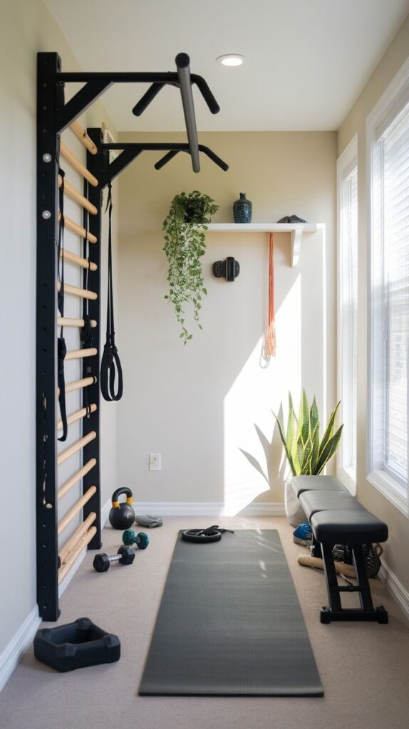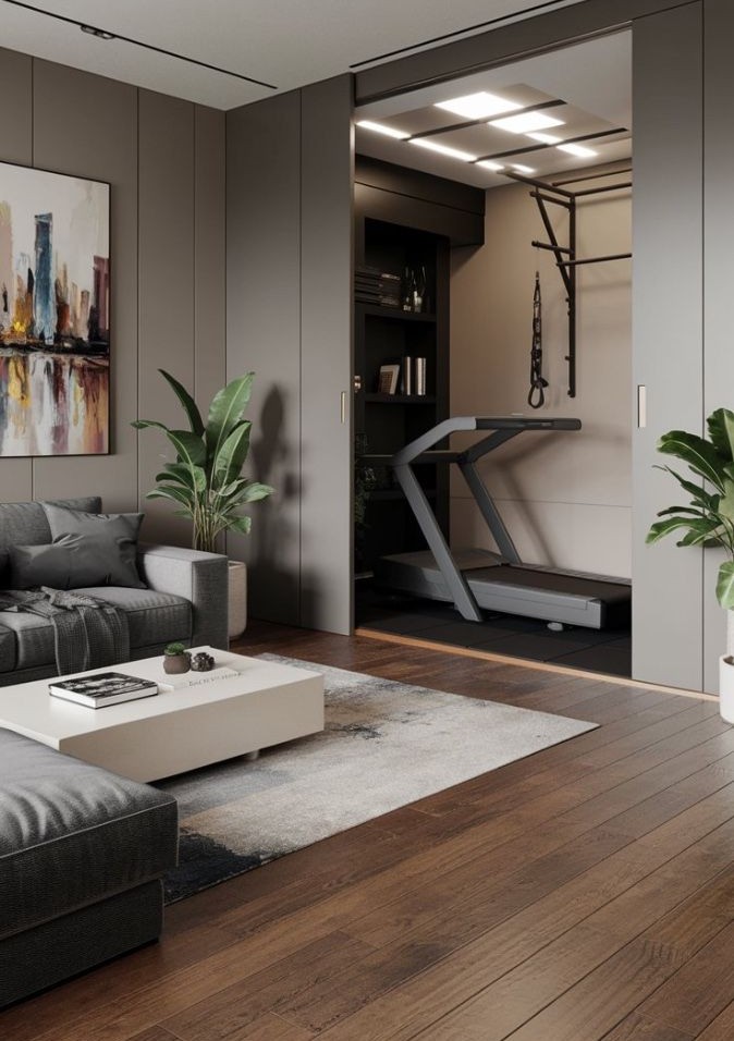 I pannelli a scomparsa sono un’altra idea geniale. Da chiusi si presentano come una parete pulita ed elegante, ma da aperti rivelano specchi, attrezzi appesi, o anche un piccolo schermo per seguire i workout. La stanza così può contenere più anime ed essere finalizzata tanto alla ginnastica quanto a un altro hobby.